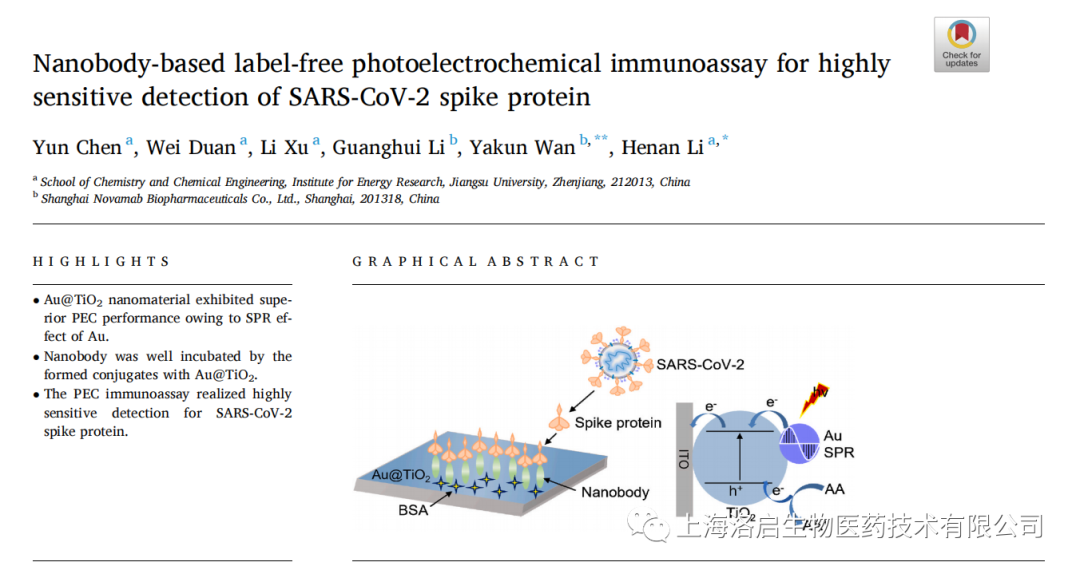 2022年5月3日,凯发K8天生赢家一触即发生物和江苏大学化学化工学院李赫楠教授团队合作,在《Analytica Chimica Acta》发表了题为“Nanobody-based label-free photoelectrochemical immunoassay for highly sensitive detection of SARS-CoV-2 spike protein”的研究论文。凯发K8天生赢家一触即发生物万亚坤博士和李贺楠教授为并列通讯作者,相关纳米抗体的知识产权归凯发K8天生赢家一触即发生物所有。